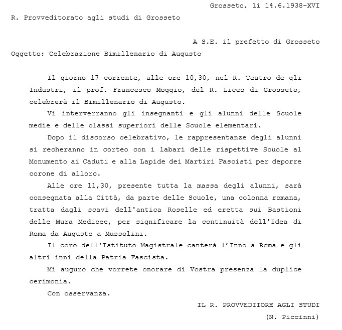 La mancata partecipazione del Ministro – impossibilitato a raggiungere la provincia per i «troppi impegni per l’anno in corso»[5] – non impedì tuttavia il regolare svolgimento della celebrazione augustea, il 17 di giugno, che si aprì con un’orazione pubblica del prof. Francesco Moggio del R. Liceo ginnasio “Carducci-Ricasoli” e vide la consegna «da parte delle scuole di una colonna romana, tratta dagli scavi dell’antica Roselle ed eretta sui bastioni della città, per significare la continuità dell’idea di Roma da Augusto a Mussolini», accompagnata dall’esecuzione, da parte del coro dell’Istituto magistrale, «dell’inno a Roma e degli altri della Patria fascista»[6].