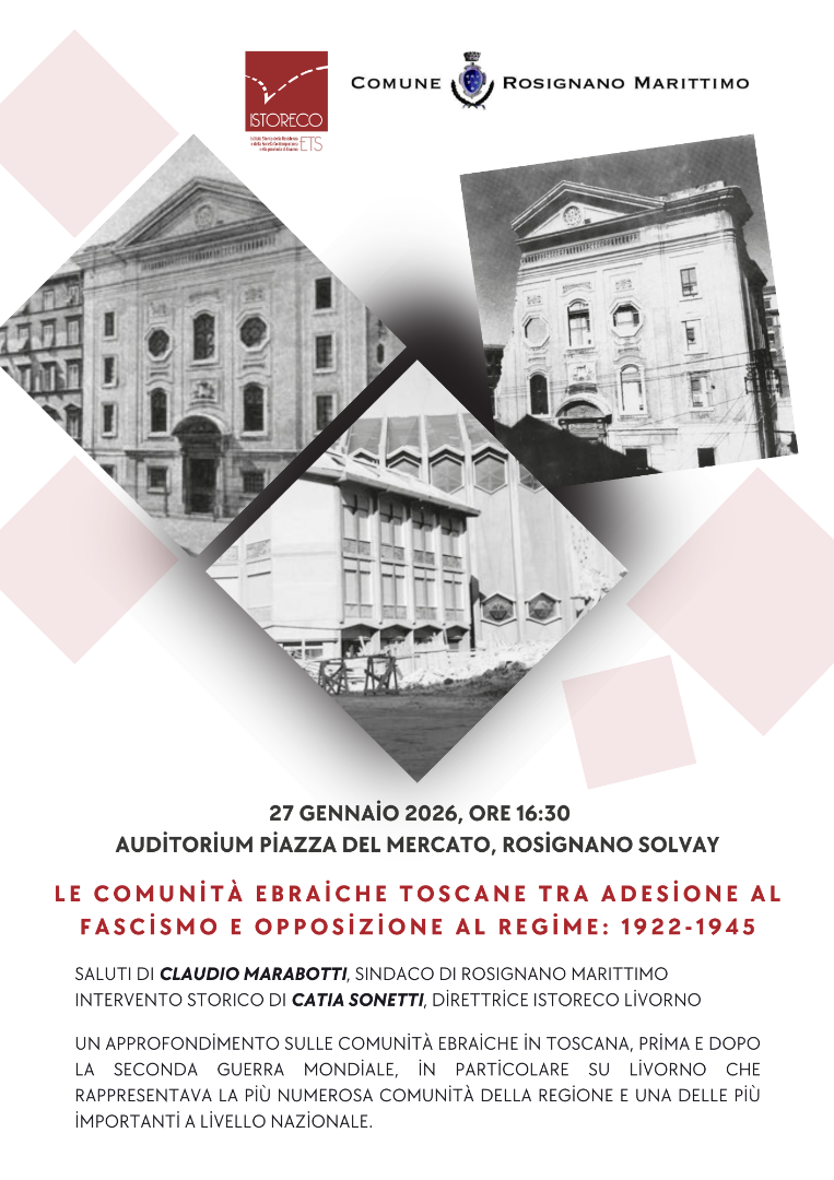 – ore 16:30, Auditorium di Piazza del Mercato, Rosignano Solvay: incontro per la cittadinanza con intervento di Catia Sonetti sul tema: Le comunità ebraiche toscane tra adesione al fascismo e opposizione al regime: 1922-1945