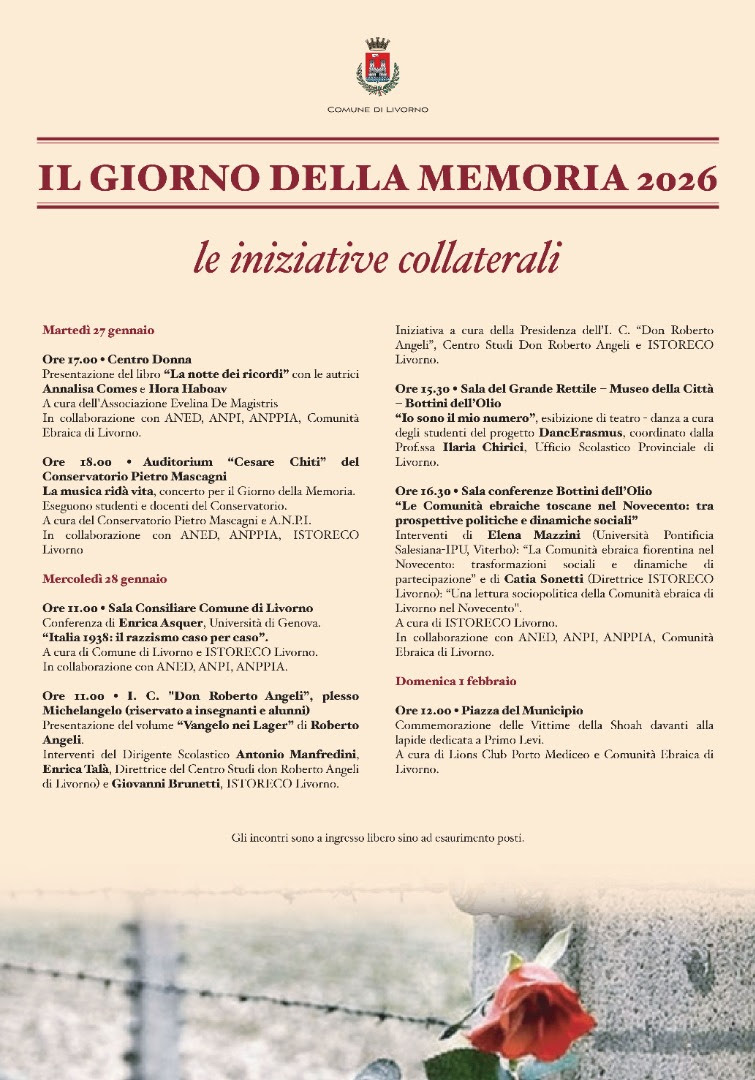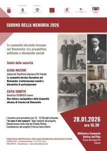 – 16.30, Biblioteca comunale – sede Bottini dell’Olio: con il patrocinio del Comune di Livorno e della Comunità ebraica di Livorno, in collaborazione con ANPI Livorno, ANPPIA Livorno, ANED Pisa: incontro pubblico Le Comunità ebraiche toscane nel Novecento: tra prospettive politiche e dinamiche sociali. Con gli interventi di Elena Mazzini (Università Pontificia Salesiana-IPU, Viterbo) e di Catia Sonetti (Direttrice ISTORECO Livorno). L’incontro sarà preceduto (ore 15/15,30) dall’esibizione “Io sono il mio numero” degli studenti del progetto DancErasmus nella Sala del Grande Rettile (Coordinatrice prof.ssa Ilaria Chirici).