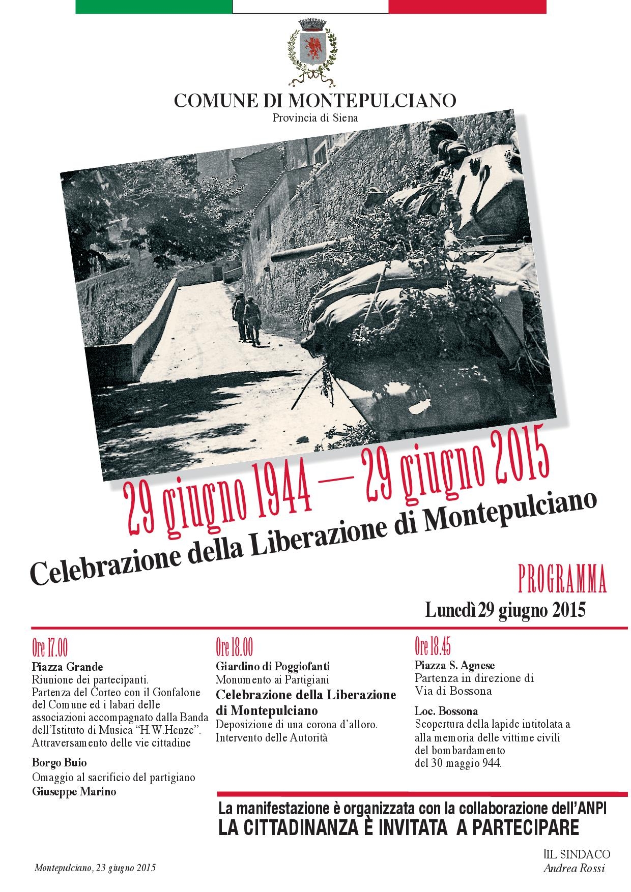 Lunedì 29 giugno si celebrerà a Montepulciano il 71° anniversario della Liberazione, avvenuta il 29 giugno 1944, quando i reparti inglesi giunsero alle porte della città. Questo appuntamento, uno dei più sentiti dalla popolazione poliziana, inizierà alle 17 con un corteo che attraverserà l’intero centro storico, preceduto dal gonfalone del Comune e dai labari dell’ANPI e delle varie associazioni cittadine, con l’accompagnamento della Banda dell’Istituto di Musica “H. W. Henze”.