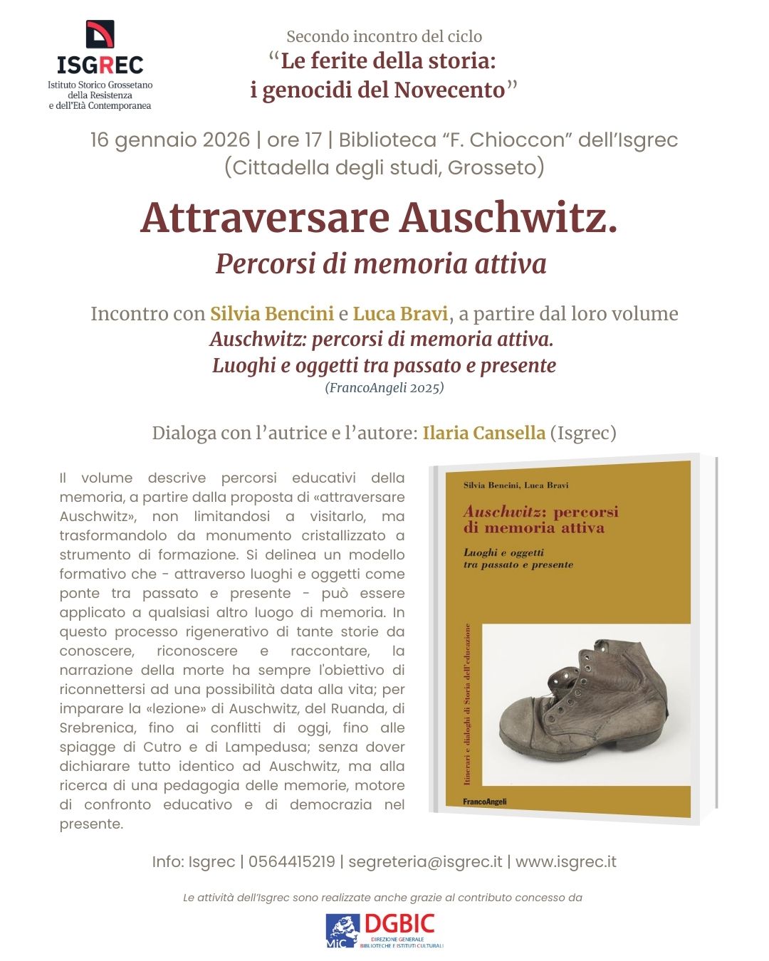 Il 16 gennaio, alle ore 17, nella Biblioteca “F. Chioccon” dell’Isgrec (Cittadella degli studi, Grosseto), si terrà il secondo incontro del ciclo “Le ferite della storia: i genocidi del Novecento”, dal titolo “Attraversare Auschwitz. Percorsi di memoria attiva”. Ilaria Cansella (Isgrec) dialogherà con Silvia Bencini e Luca Bravi, a partire dal loro volume Auschwitz: percorsi di memoria attiva. Luoghi e oggetti tra passato e presente (FrancoAngeli 2025), che descrive percorsi educativi della memoria, a partire dalla proposta di «attraversare Auschwitz», non limitandosi a visitarlo, ma trasformandolo da monumento cristallizzato a strumento di formazione. Gli autori delineano un modello formativo che – attraverso luoghi e oggetti come ponte tra passato e presente – può essere applicato a qualsiasi altro luogo di memoria. In questo processo rigenerativo di tante storie da conoscere, riconoscere e raccontare, la narrazione della morte ha sempre l’obiettivo di riconnettersi ad una possibilità data alla vita; per imparare la «lezione» di Auschwitz, del Ruanda, di Srebrenica, fino ai conflitti di oggi, fino alle spiagge di Cutro e di Lampedusa; senza dover dichiarare tutto identico ad Auschwitz, ma alla ricerca di una pedagogia delle memorie, motore di confronto educativo e di democrazia nel presente.