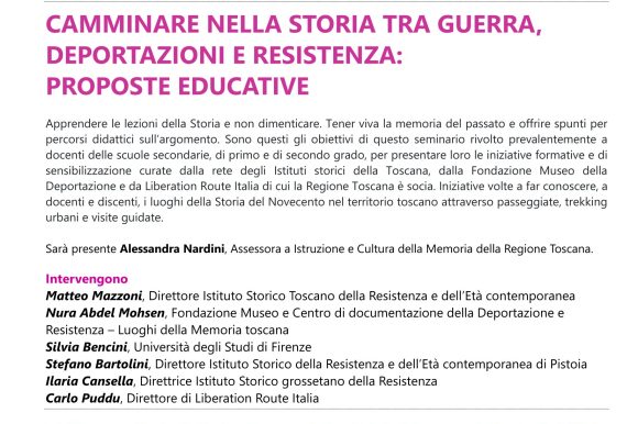 Apprendere le lezioni della Storia, tener viva la memoria del passato e offrire spunti per percorsi didattici. Sono gli obiettivi del seminario rivolto a docenti delle scuole secondarie di primo e secondo grado che illustra iniziative formative e di sensibilizzazione volte a far conoscere i luoghi della Storia del Novecento toscano attraverso passeggiate e visite guidate, curate dalla rete degli Istituti storici della Toscana, Fondazione Museo della Deportazione e Liberation Route Italia.