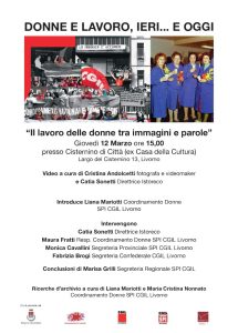 Giovedì 12 marzo (alle ore 15) presso il Cisternino di Città si terrà l’incontro Donne e lavoro, ieri… e oggi: una proposta di discussione sul tema del lavoro femminile in cui sarà presentato il video realizzato da SPI-CGIL Livorno e ISTORECO Il lavoro delle donne tra immagini e parole. L’audiovisivo, curato dalla Direttrice ISTORECO Catia Sonetti insieme a Cristina Andolcetti, a partire da una serie di affascinanti immagini di lavoratrici femminili costruisce un interessante momento di riflessione sul tema delle lavoro delle donne dalla fine dell’Ottocento ai nostri giorni. Accanto alle immagini d’archivio sono collocate anche tre voci femminili che ci parlano del lavoro nel nostro presente. L’incontro sarà introdotto da Liana Mariotti (Coordinamento Donne SPI-CGIL Livorno, autrice anche delle ricerche insieme a Maria Cristina Nonnato) e vedrà la partecipazione di Catia Sonetti, Maura Fratti (Coordinamento Donne SPI-CGIL Livorno), Monica Cavallini (Segreteria provinciale SPI-CGIL Livorno), Fabrizia Brogi (Segreteria confederale CGIL Livorno) e Marisa Grilli (Segreteria regionale SPI CGIL).