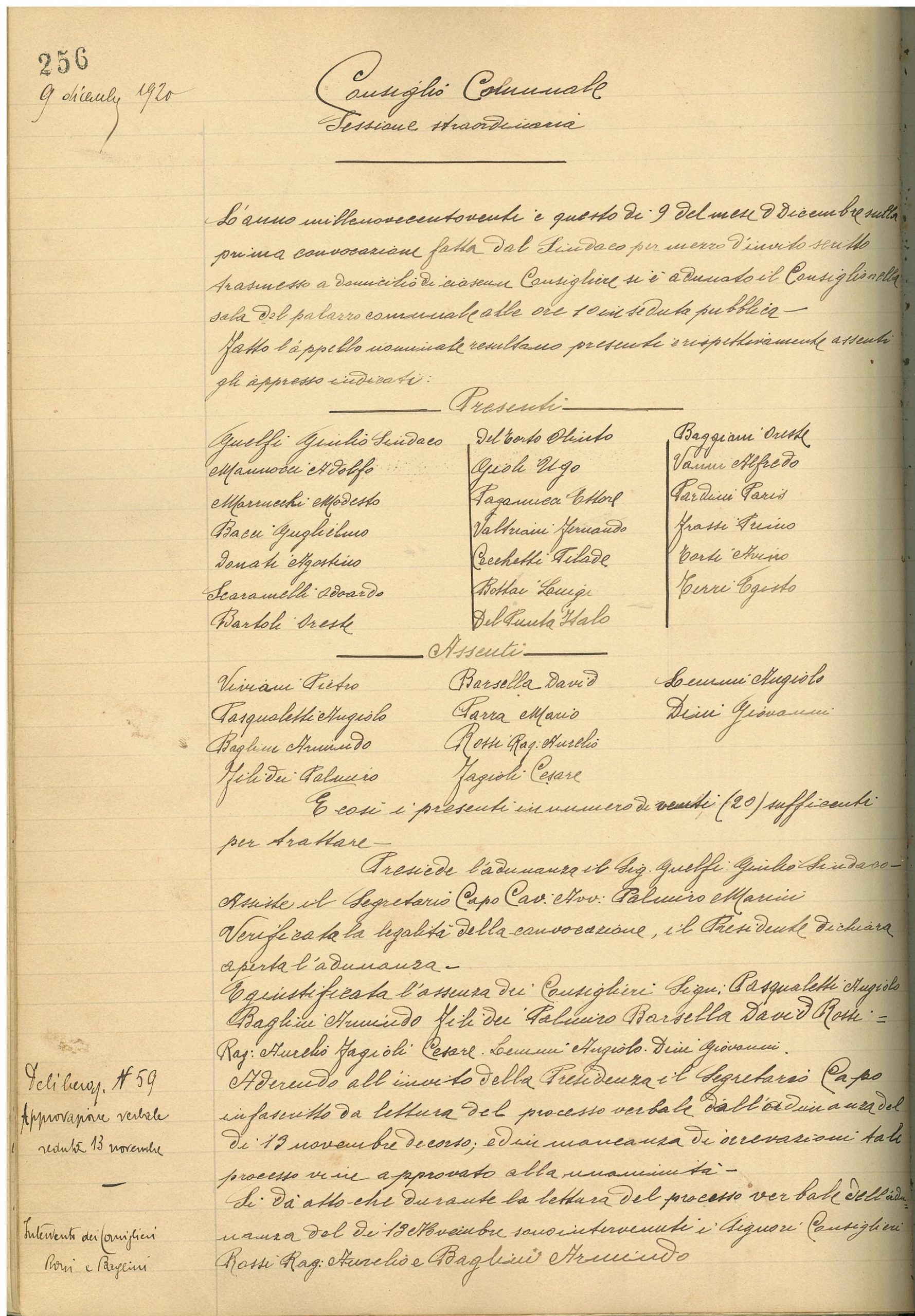 19 ASC Cascina, Verbale seduta Giunta Comunale del 9 dicembre 1920.