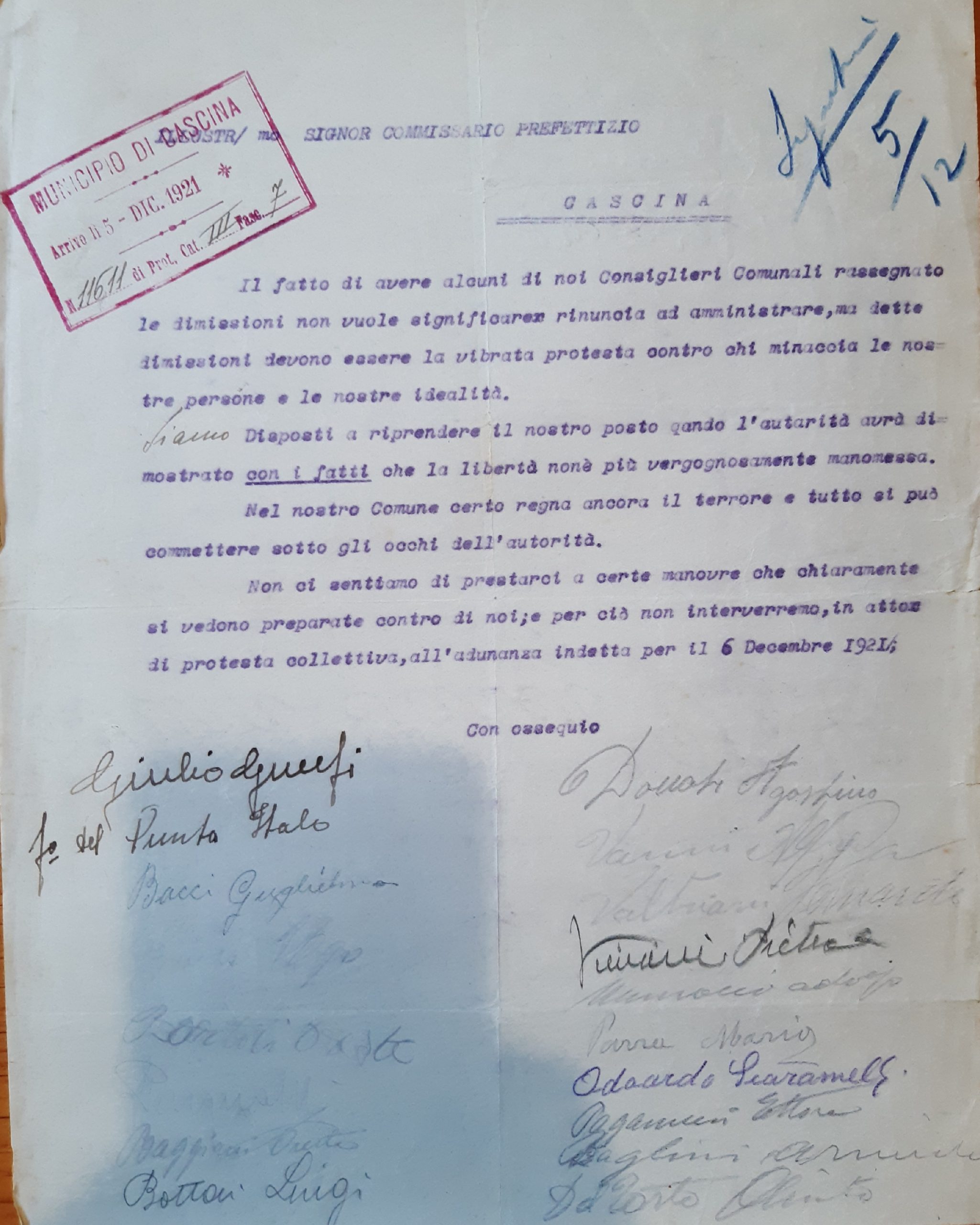 Intanto tra settembre e novembre le pressioni e le violenze fasciste nei confronti dei consiglieri socialisti e comunisti danno i propri risultati e al protocollo del Comune di Cascina giungono le dimissioni irrevocabili di gran parte degli eletti. Si tratta di comunicazioni che naturalmente non denunciano pressioni o violenza e adducono principalmente motivi personali, tra questi l’assessore Alfredo Vanni scrive che non ritiene «più opportuno ricoprire tale carica»[32], mentre solamente il consigliere comunale Modesto Marrucchi motiva le proprie dimissioni dichiarando di aver maturato la propria distanza dal Partito comunista. A queste dichiarazioni dei consiglieri comunali segue però un ultimo atto di resistenza istituzionale, una lettera di protesta inviata al Commissario prefettizio, che vede come primo firmatario Giulio Guelfi e di seguito tutti i consiglieri comunali socialisti e comunisti dimissionari. Nella nota i consiglieri comunali denunciano coraggiosamente le violenze fasciste subite: «Il fatto di aver alcuni di noi […] rassegnato le dimissioni non vuole significare la rinuncia ad amministrare, ma dette dimissioni devono essere la vibrata protesta contro chi minaccia le nostre persone e le nostre idealità […] Nel nostro Comune certo regna ancora il terrore e tutto si può commettere sotto gli occhi dell’autorità»[33].