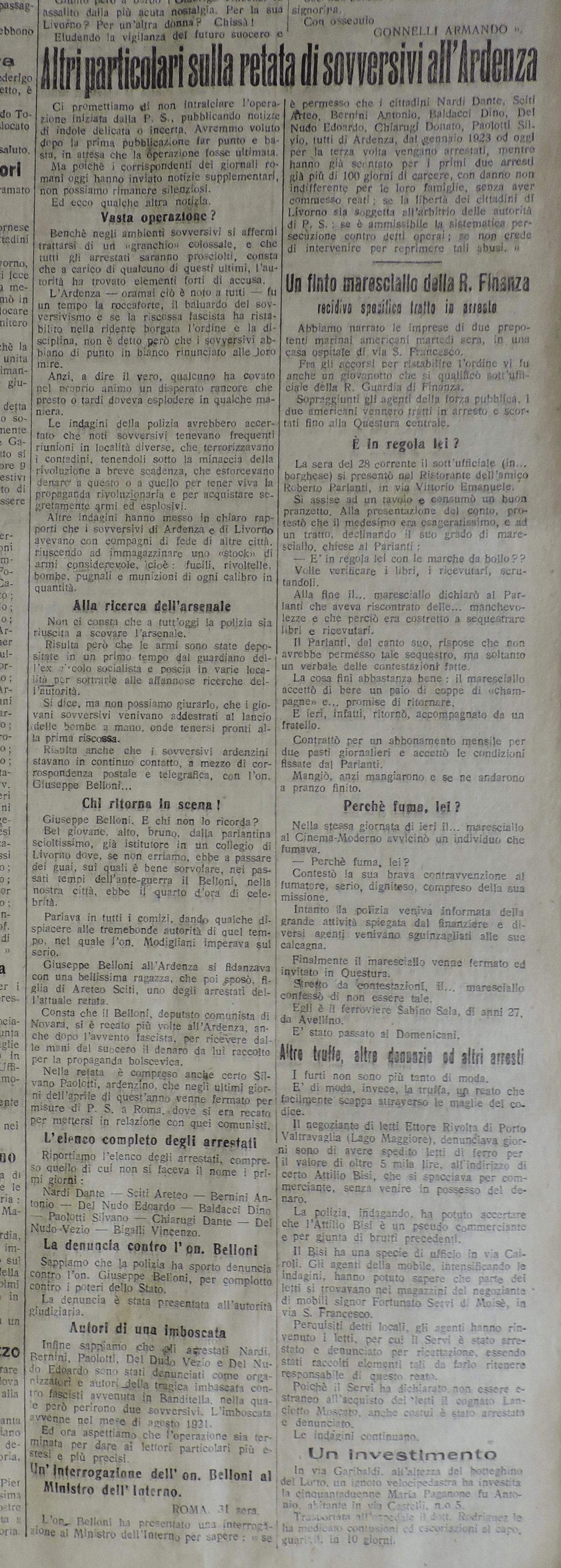 «Le indagini della polizia avrebbero accertato che noti sovversivi tenevano frequenti riunioni in località diverse, che terrorizzavano i contadini, tenendoli sotto la minaccia della rivoluzione a breve scadenza, che estorcevano denaro a questo o a quello per tener viva la propaganda rivoluzionaria e per acquistare segretamente armi ed esplosivi. Altre indagini hanno messo in chiaro rapporti che i sovversivi di Ardenza e di Livorno avevano con compagni di fede di altre città, riuscendo ad immagazzinare uno “stock” di armi considerevole, cioè: fucili, rivoltelle, bombe, pugnali e munizioni di ogni calibro in quantità. Non ci consta che a tutt’oggi la polizia sia riuscita a scovare l’arsenale. Risulta però che le armi sono state depositate in un primo tempo dal guardiano dell’ex circolo socialista […] Risulta anche che i sovversivi stavano in continuo contatto, a mezzo corrispondenza postale telegrafica, con l’on. Giuseppe Belloni… E chi non se lo ricorda? Bel giovane, alto, bruno, dalla parlantina scioltissimo, già istitutore in un collegio di Livorno dove, se non erriamo, ebbe a passare dei guai, sui quali è bene sorvolare nei passati tempi dell’ante-guerra. Il Belloni nella nostra città, ebbe il quarto d’ora di celebrità. Parlava in tutti i comizi, dando qualche dispiacere alle tremebonde autorità di quel tempo, nel quale l’on. Modigliani imperava sul serio. Giuseppe Belloni all’Ardenza si fidanzava con una bellissima ragazza, che poi sposò. Figlia di Areteo Sciti, uno degli arrestati dell’attuale retata. Consta che il Belloni, deputato comunista di Novara, si è recato più volte all’Ardenza, anche dopo l’avvento fascista, per ricevere dalle mani del suocero il denaro da lui raccolto per la propaganda bolscevica. Nella retata è compreso anche certo Silvano Paolotti, ardenzino, che negli ultimi giorni dell’aprile di quest’anno venne fermato per misure di P.S. a Roma dove si era recato per mettersi in relazione con quei comunisti […] Infine sappiamo che gli arrestati Nardi, Bernini, Paolotti, Del Nudo Vezio e Del Nudo Edoardo sono stati denunciati come organizzatori e autori della tragica imboscata contro fascisti avvenuta in Banditella, nella quale però perirono due sovversivi. L’imboscata avvenne nel mese di agosto 1921»[18].