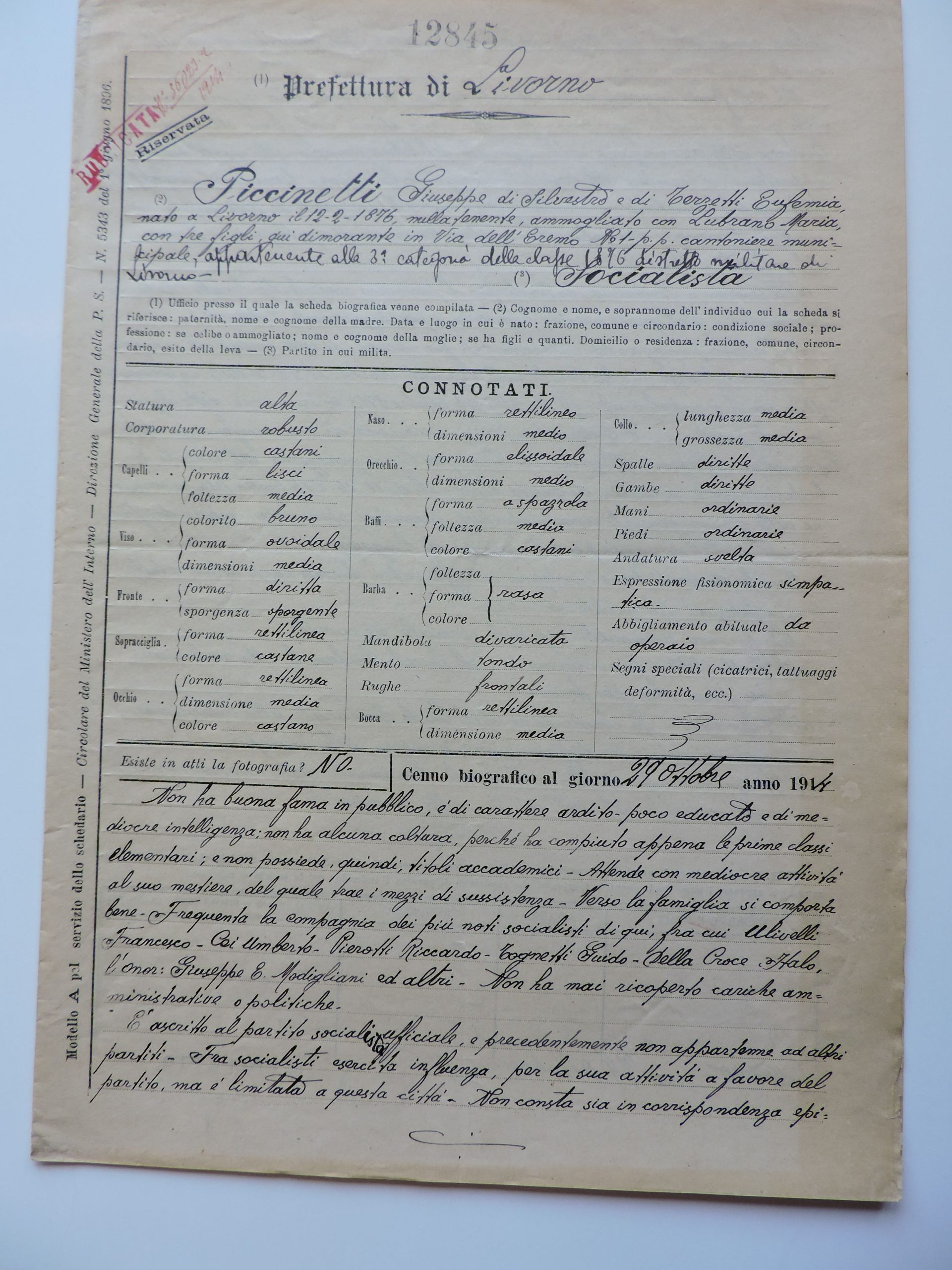 la sua “schedatura” da parte degli organi di polizia, quale socialista, abitante in via dell’Eremo 1, coniugato con Maria Lubrano (1883-1967) e, dal 1906, padre di Bruno (futuro militante comunista[5]).