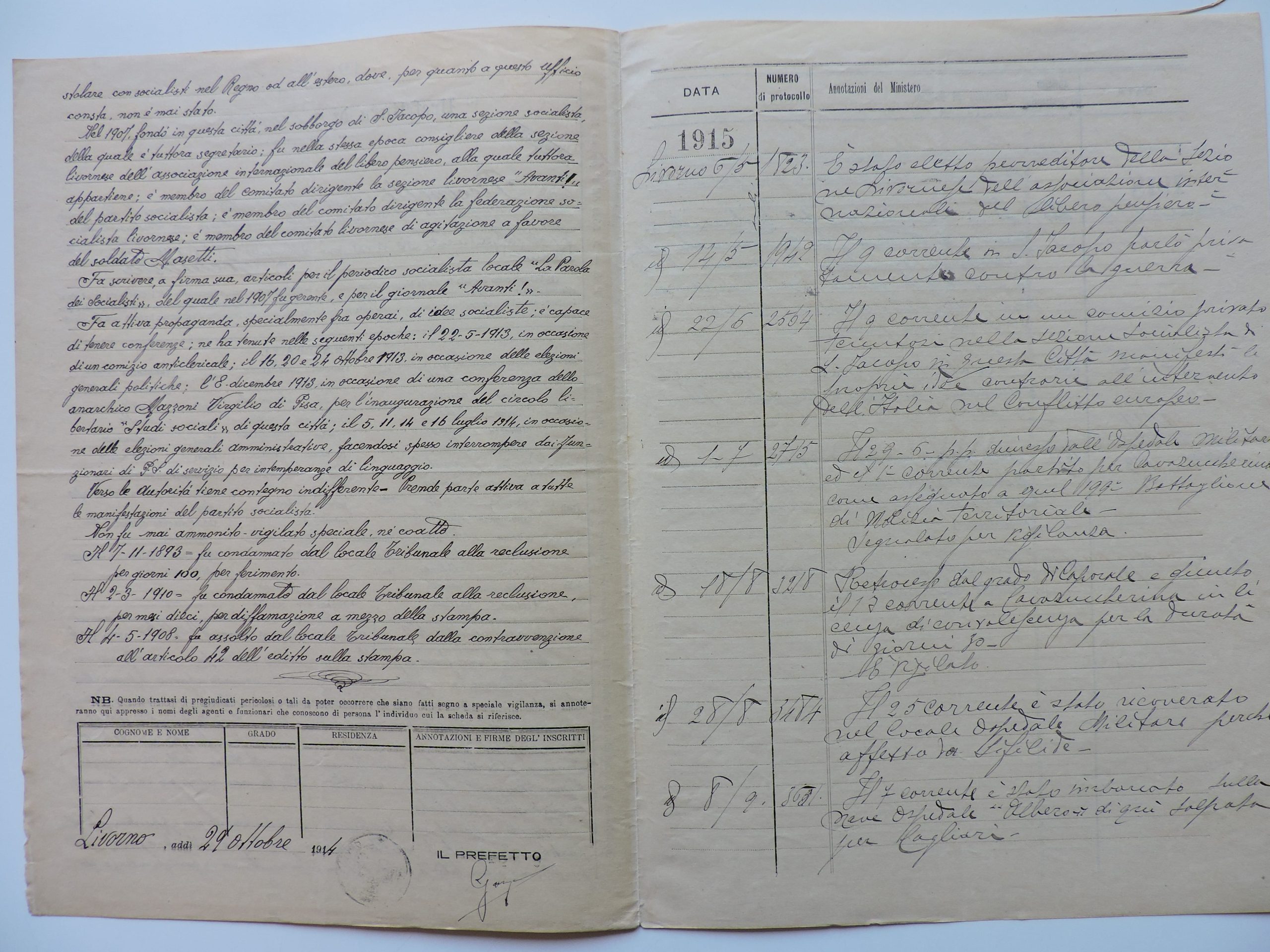 Nello stilarne il “profilo biografico”, vennero annotati i suoi “precedenti” giudiziari, per lo più legati a reati inerenti la stampa, in quanto oltre che collaboratore fu per diversi anni gerente responsabile de «La Parola dei Socialisti», il giornale della sezione livornese, fondato nel 1901.