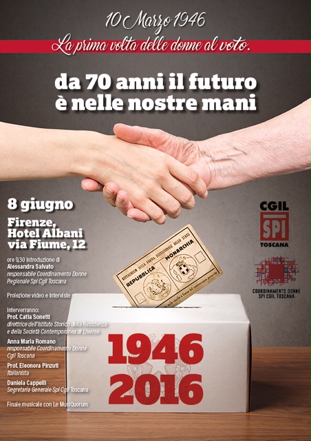 L’8 giugno a Firenze, presso l’Hotel Albani di via Fiume 12, il direttore Istoreco Catia Sonetti parteciperà all’iniziativa del Coordinamento Donne della Spi Cgil Toscana “10 marzo 1946. La prima volta delle donne al voto. Da 70 anni il futuro è nelle nostre mani”. Alle 9.30 introduzione di Alessandra Salvato, responsabile Coordinamento Donne della Spi Cgil Toscana. Seguiranno, dopo la proiezione di video e interviste, l’intervento di Catia Sonetti, Anna Maria Romano, responsabile Coordinamento Donne Cgil Toscana, la professoressa Eleonora Pinzuti, italianista, Daniela Cappelli, Segretaria Generale Spi Cgil Toscana. Finala musiciale con Le Musiquorum.