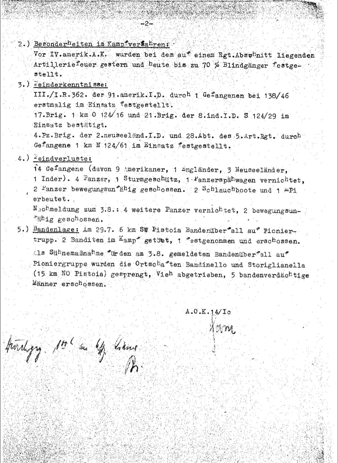 Va poi preso in esame un altro dettaglio, forse tra i più esacerbati da parte delle ricostruzioni sull’uccisione di Fedi proposte finora. Nel dopoguerra, in molte delle testimonianze rilasciate dagli ex-partigiani pistoiesi si può riscontrare un certo accordo sul fatto che quella dei tedeschi fosse stata un’imboscata preparata in modo tale da colpire il nucleo delle Squadre. Questa osservazione però non è mai stata vagliata criticamente, sebbene ci sia tanto da dire su di essa, a partire dal fatto che chiunque venga colto di sorpresa in un conflitto a fuoco abbia quasi sempre la percezione di essere stato messo in trappola. Né si è tentato di elaborare ulteriormente uno dei bollettini dell’Armeeoberkommando 14, già noto, nel quale si legge che il 29 luglio furono le truppe tedesche a subire un attacco dai partigiani e non il contrario. Cosa non difficile da credere, se si pensa che nelle relazioni delle Squadre Franche si fa menzione di un altro conflitto a fuoco, avvenuto quella stessa mattina e che ebbe come protagonista una delle pattuglie poste da Fedi a copertura del centro della formazione. Il comandante partigiano non era stato messo a conoscenza di questa prima schermaglia, ma se assumiamo che questo scontro abbia effettivamente avuto luogo (fatto del quale ci danno conferma sia la relazione delle Squadre Franche che i documenti tedeschi), ciò potrebbe anche suggerire un’altra spiegazione ai fatti di quel giorno. In breve, l’incontro tra i pionieri e la formazione partigiana potrebbe essere avvenuto a seguito della battaglia mattutina, la quale avrebbe poi spinto le unità del Pi. Batl. 60 a indagare più a fondo nelle zone a sud di Pistoia. Un altro dettaglio a questo proposito è costituito dalle operazioni alle quali era stata originariamente destinata l’unità responsabile dell’uccisione di Fedi: il 29 luglio 1944, infatti, i pionieri del 14. Panzerkorps dovevano minare un tunnel ferroviario nei pressi di Serravalle insieme a una unità del Genio ferroviario, la Eisenbahn-Pionier-Kompanie 84. In questo documento non si parla né di rastrellare una precisa area, né tantomeno di dare la caccia a una specifica squadra partigiana, il che alimenta l’ipotesi (pur senza confermarla) di un incontro avvenuto per caso o a seguito di un attacco della pattuglia di Fedi a una delle due formazioni nemiche (se non a entrambe).