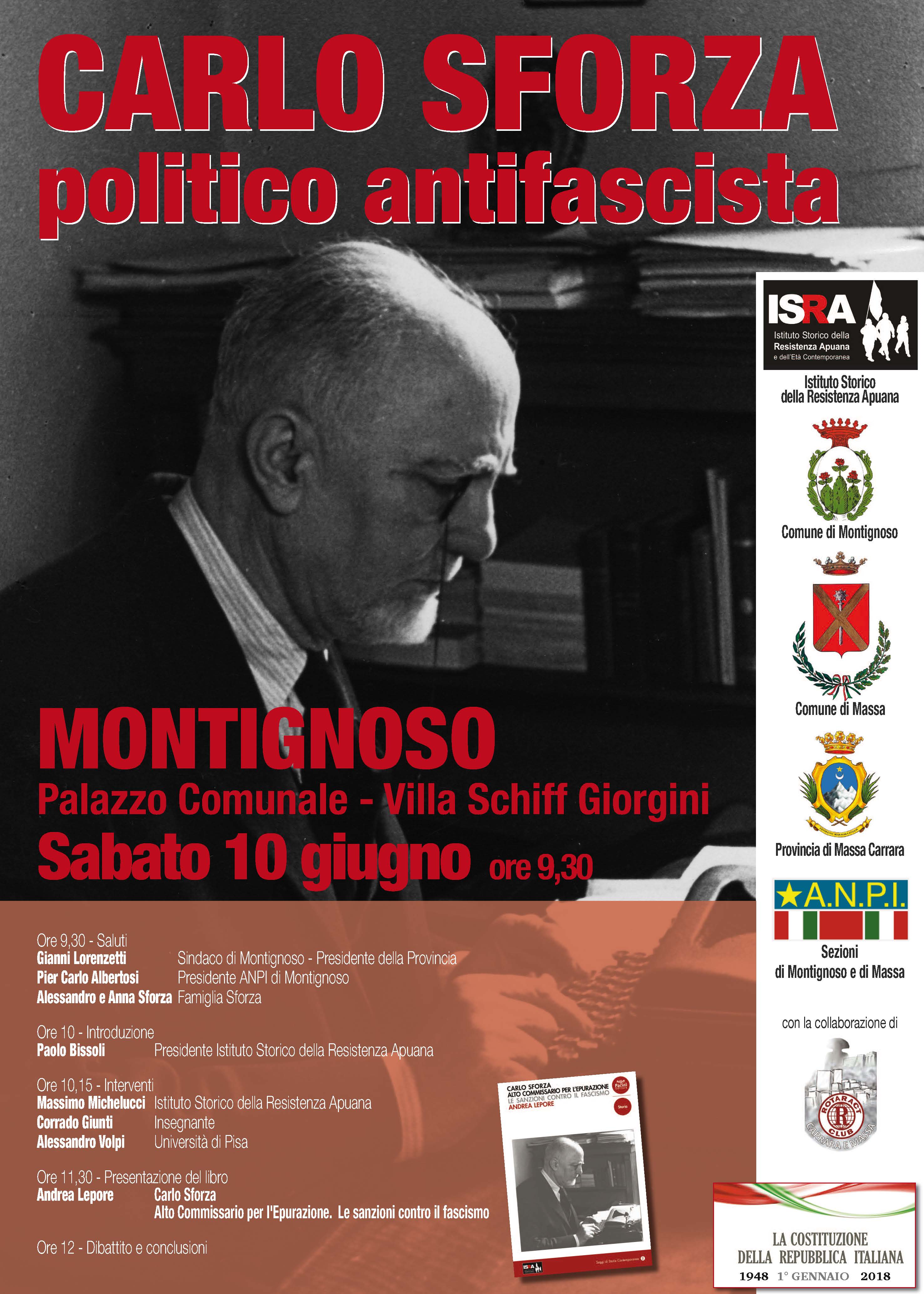 Sabato 10 giugno a Montignoso (Massa Carrara), presso la sede Comunale di Villa Schiff Giorgini, dalle ore 9,30, si terrà il convegno “Carlo Sforza politico antifascista” e la presentazione della pubblicazione “Carlo Sforza- Alto Commissario per l’epurazione. Le sanzioni contro il fascismo” di Andrea Lepore, organizzato dall’Istituto Storico della Resistenza Apuana, in collaborazione con le Sezioni ANPI di Massa e Montignoso.