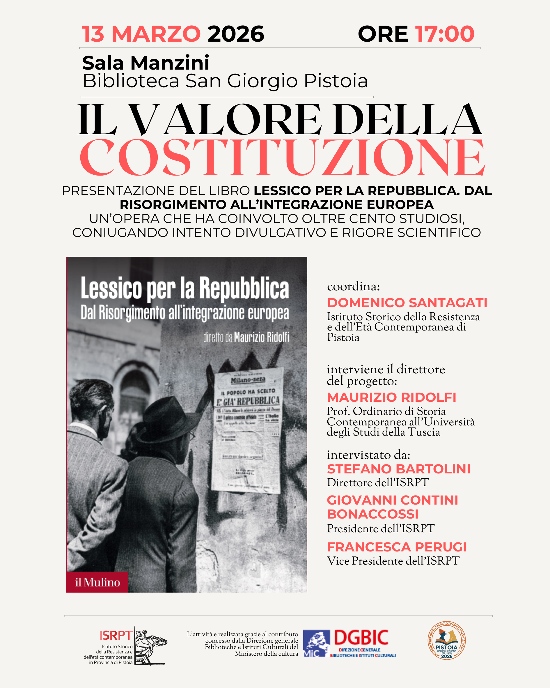 In un momento in cui la discussione intorno ai valori costituzionali è diventata argomento di grande attualità, l’Istituto Storico della Resistenza e dell’età contemporanea di Pistoia (ISRPT) intende dare il suo contributo per aiutare a comprendere i contesti dei cambiamenti costituzionali e i riferimenti culturali rappresentativi dell’idea di Repubblica.