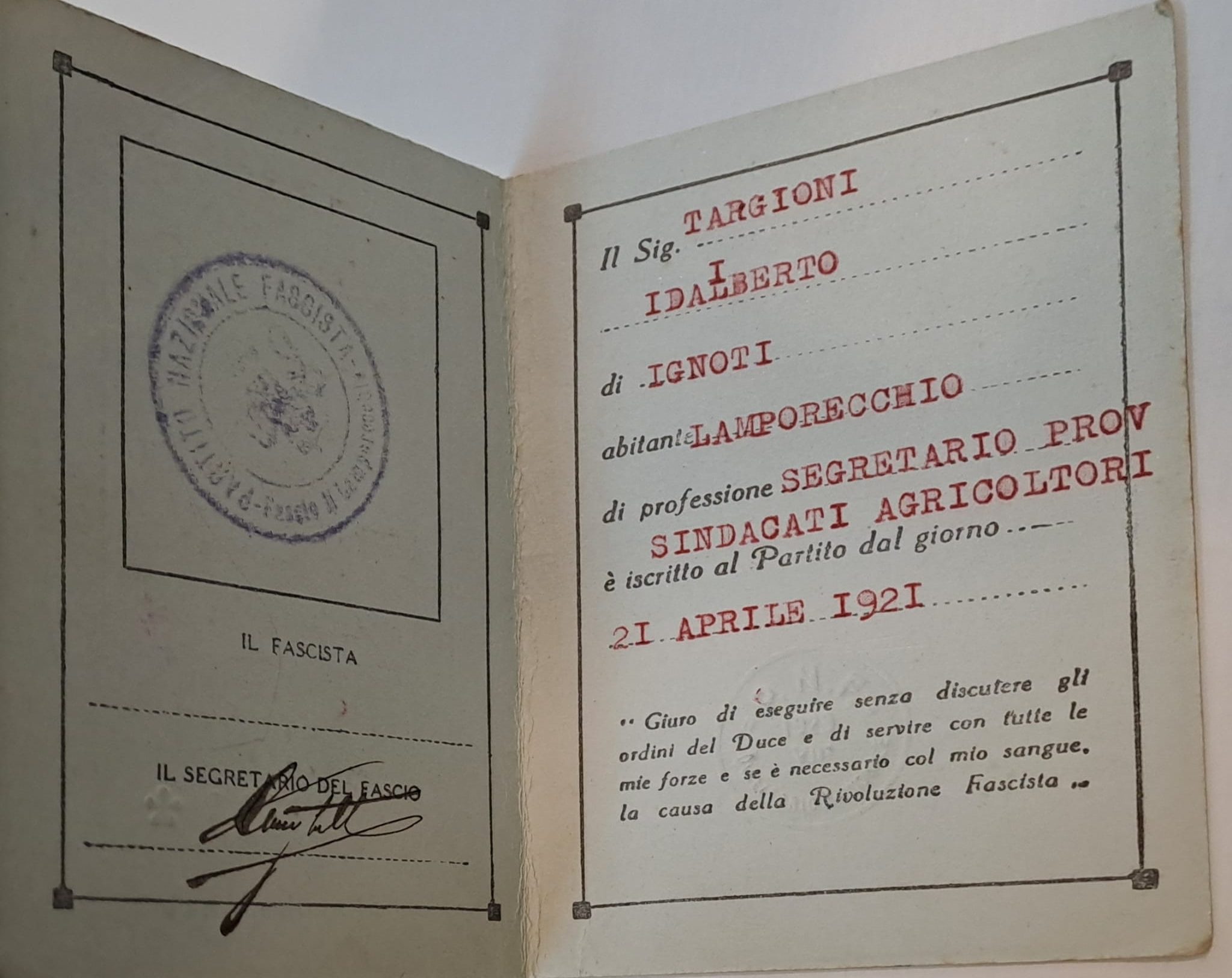 Il fondo Idalberto Targioni consta di quattordici buste archivistiche e di circa duecento volumi a stampa; al termine del lavoro di inventariazione, curato da Marta Bonsanti, la documentazione viene organizzata in sette serie, restituendo una struttura coerente a un corpus documentario ampio e articolato. La prima serie raccoglie la corrispondenza di Targioni, familiare e non; la seconda e la terza comprendono la produzione edita e inedita di carattere letterario e politico; la quarta è dedicata alla documentazione relativa al fascio di Lamporecchio e alle organizzazioni sindacali fasciste; la quinta conserva i documenti personali, tra cui atti giuridici e materiali fotografici; la sesta riunisce materiali a stampa, in parte riconducibili alla biblioteca privata del soggetto produttore; l’ultima serie è composta da documentazione prodotta o raccolta dai familiari, in larga misura postuma.