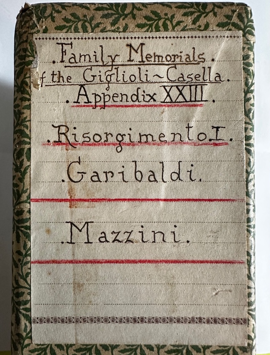 Dorso dell’App. XXIII dei Family Memorials of the Giglioli-Casella. Risorgimento I. Garibaldi e Mazzini