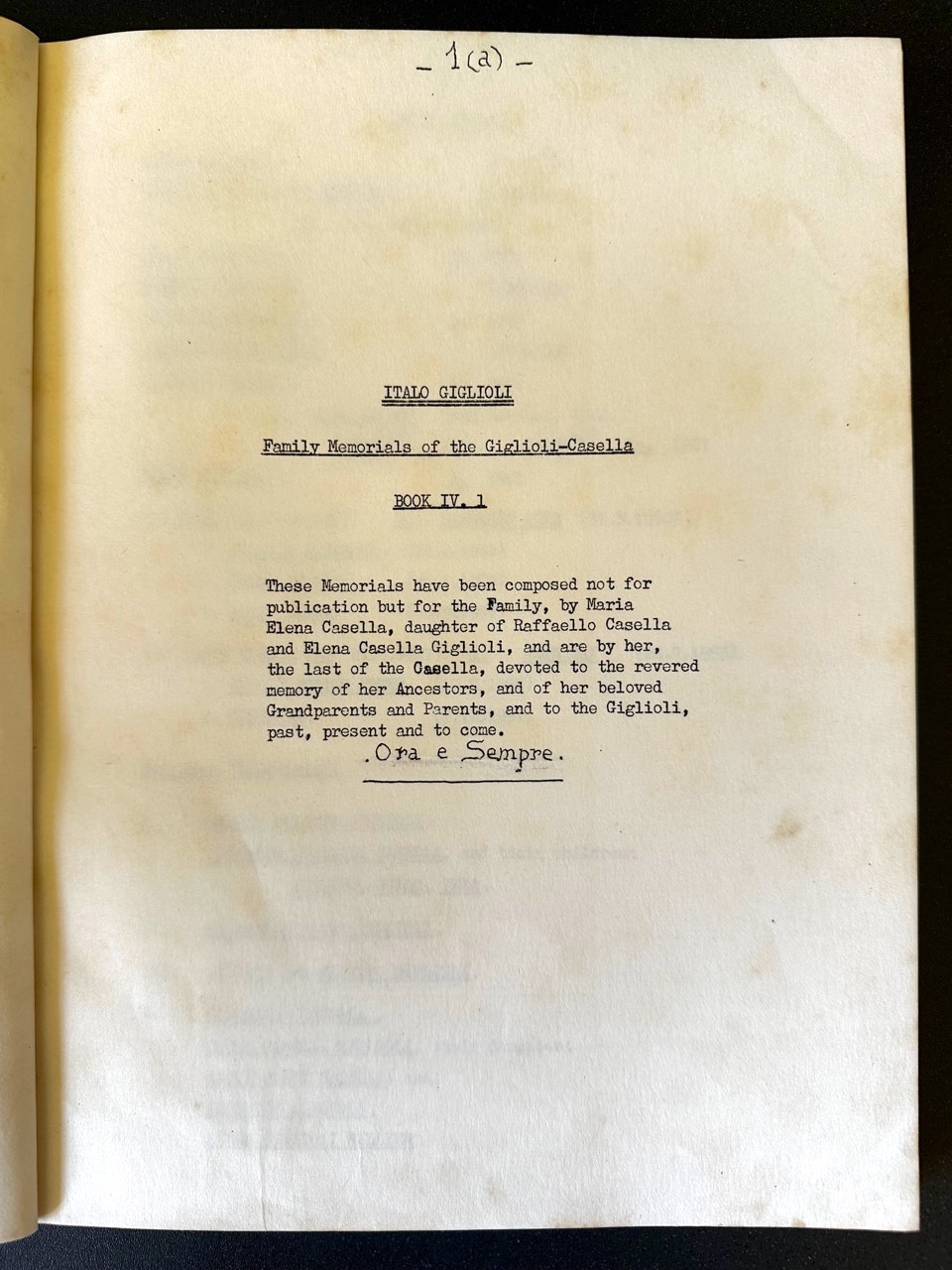 Frontespizio del dattiloscritto “Italo Giglioli. Family Memorials of the Giglioli-Casella. Book IV.1