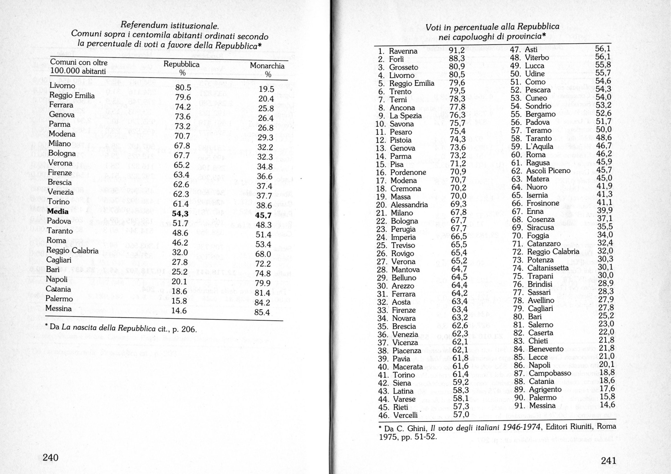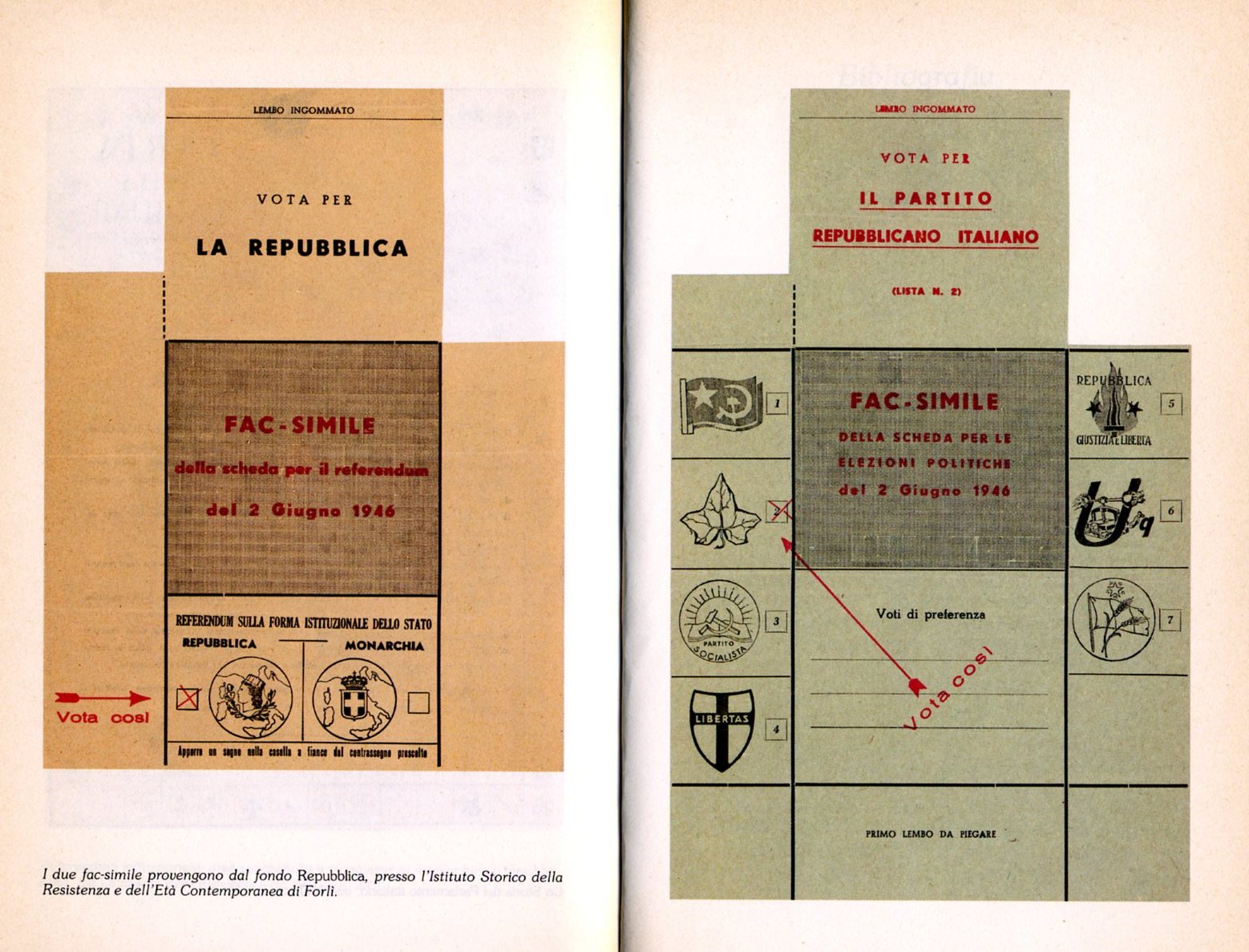 Il 2 giugno 1946 il popolo italiano si espresse in favore della repubblica. La campagna elettorale fu assai vivace, e l’affluenza alle urne fu altissima: votò l’89,1 per cento dei 28.005.449 aventi diritto, per un totale di 24.947.187 votanti. La forma repubblicana venne sostenuta da 12.717.923 voti contro i 10.719.284 a favore della monarchica.