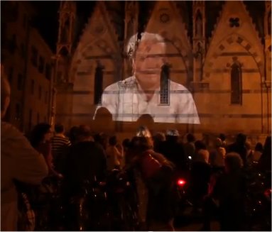 Dietro alla bici-proiettore si pedala attraverso i luoghi coinvolti negli eventi di quell’estate funesta, ma anche attraverso il tempo della memoria: Pisa è avvolta nella fame e nella paura, costretta a un coprifuoco di 22 ore, sospesa in un terrore quasi surreale. La Piazza dei Miracoli è un fossa comune, il Duomo è trasformato in accampamento da una folla di disperati, il Camposanto monumentale brucia nella tragica notte del 28 luglio, colpito da una cannonata.