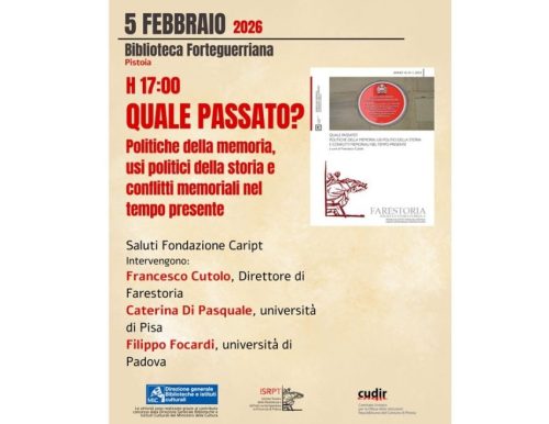Il 5 febbraio verrà presentato alla biblioteca Forteguerriana di Pistoia, alle 17:00, il numero di Farestoria Quale Passato? Politiche della memoria, usi politici della storia e conflitti memoriali nel tempo presente, con i saluti della Fondazione Caript e gli interventi di Francesco Cutolo, Direttore di Farestoria, Caterina Di Pasquale dell’Università di Pisa e Filippo Focardi dell’Università di Padova.