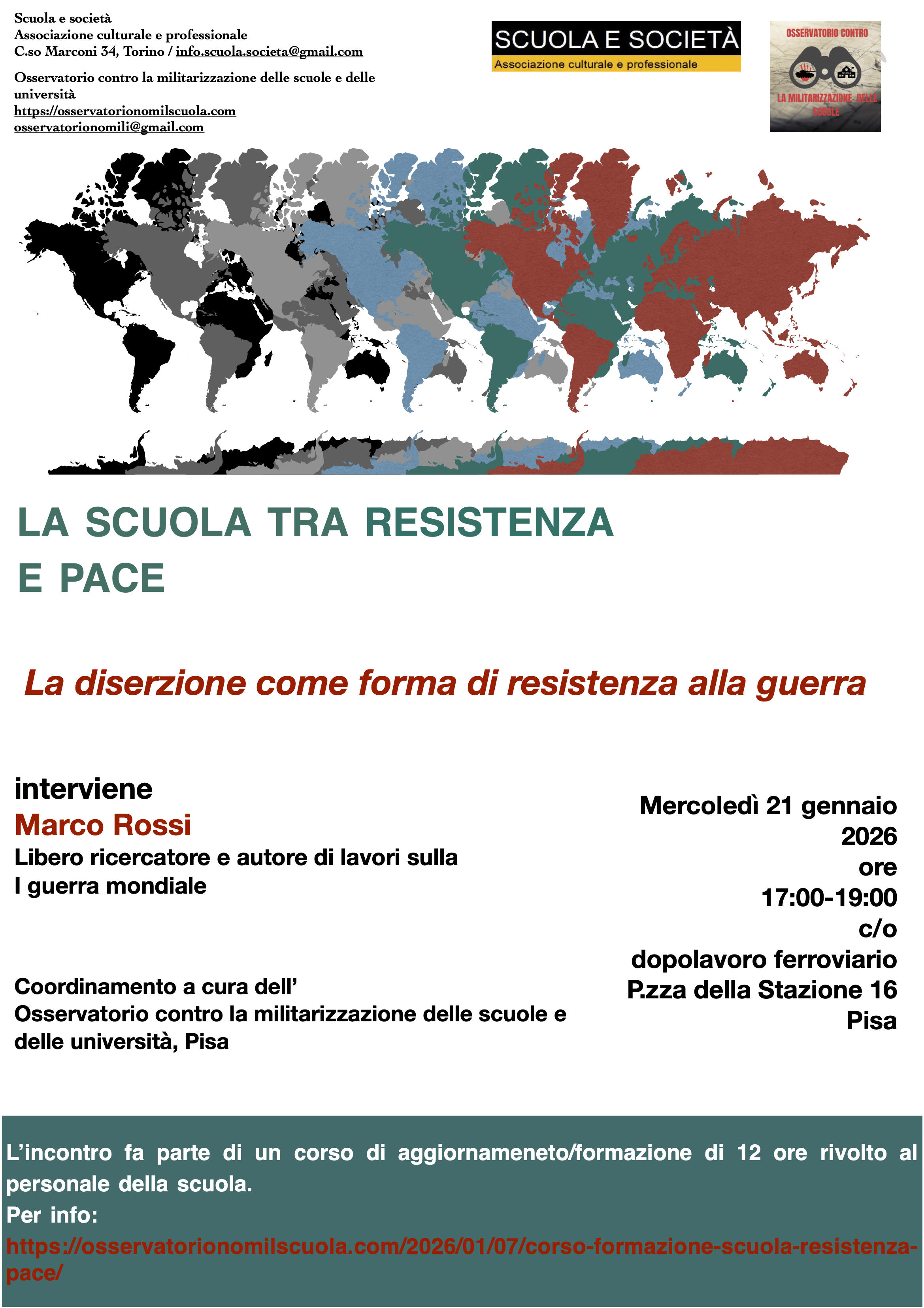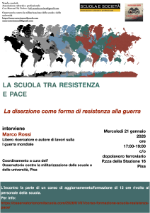 L’Osservatorio contro la militarizzazione delle scuole e delle Università e l’associazione “Scuola e Società” hanno organizzato un corso di formazione nazionale  “La scuola tra Resistenza e Pace”  il cui primo incontro si terrà in modalità mista a Pisa il 21 gennaio ore 17.00 presso i locali del Dopolavoro ferroviario, piazza della Stazione n. 16.