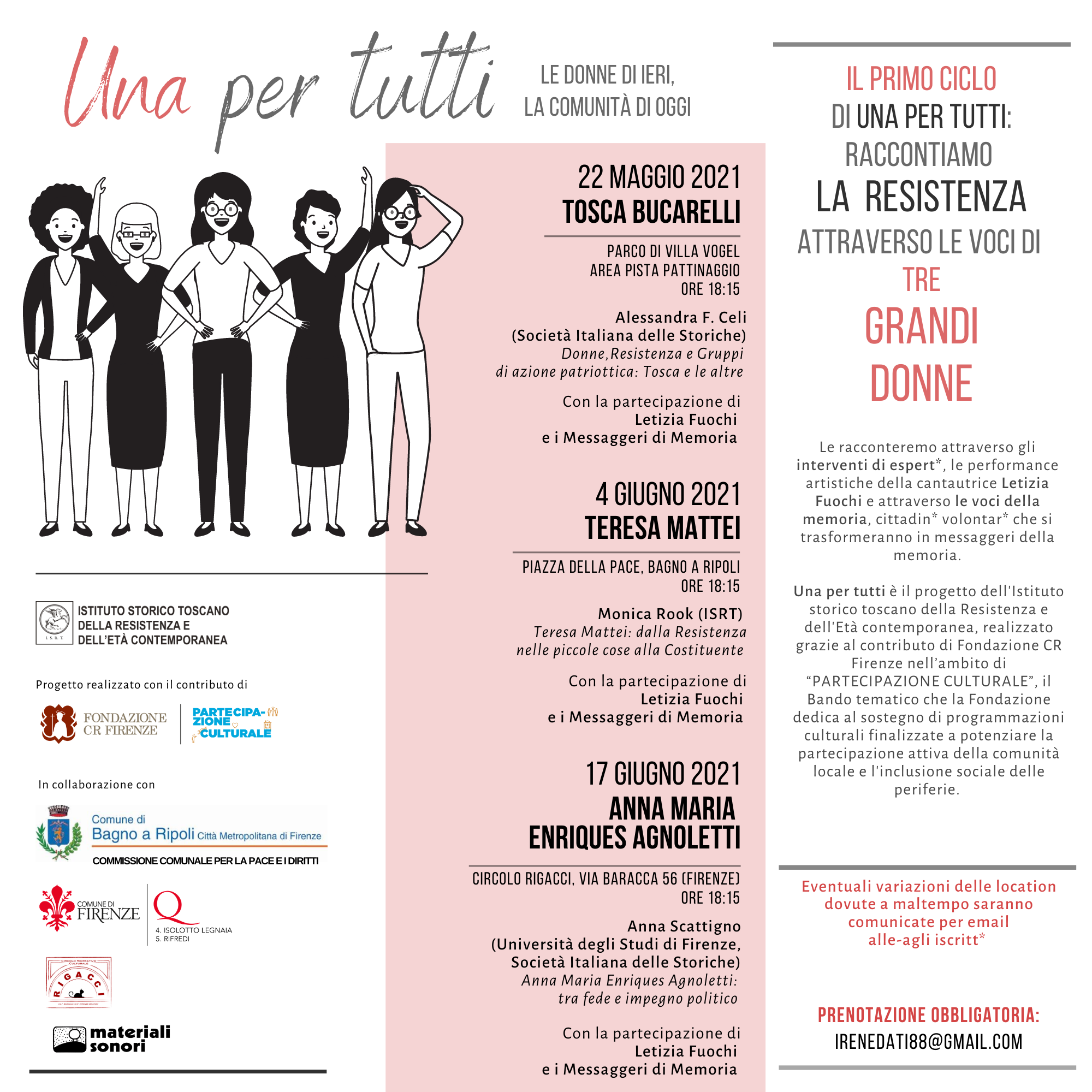 Una per tutti è il progetto dell’Istituto storico toscano della Resistenza e dell’Età contemporanea, realizzato grazie al contributo di Fondazione CR Firenze nell’ambito di “Partecipazione culturale”, il Bando tematico che la Fondazione dedica al sostegno di programmazioni culturali finalizzate a potenziare la partecipazione attiva della comunità locale e l’inclusione sociale delle periferie.