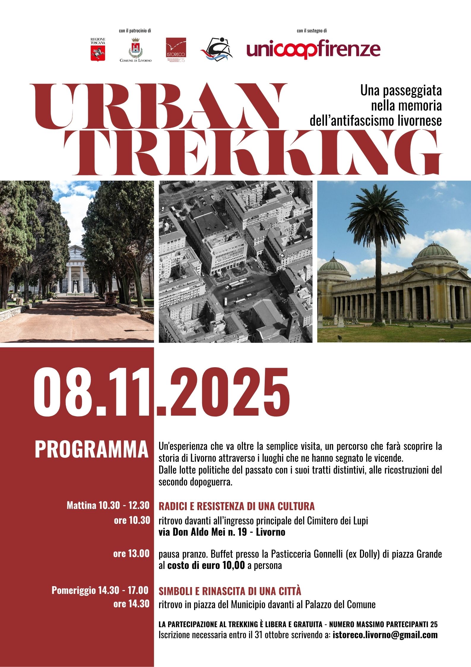 La partecipazione al trekking è libera e gratuita. L’ iniziativa è stata organizzata da ISTORECO grazie al sostegno di Unicoop Firenze ed ha il patrocinio del Comune di Livorno.